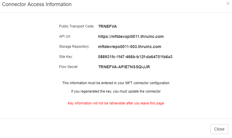 As indicated, save this information as you will need it to configure the “Thru MFT Connector.”