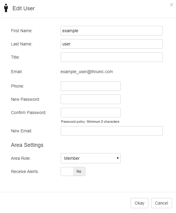 The users Area Role can be changed and the user can turn on Receive Alerts to be notified by email or SMS.