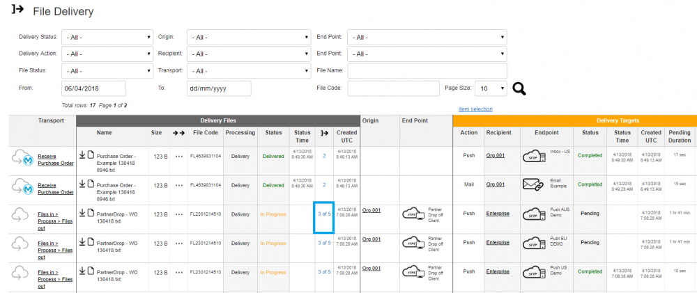 Clicking on the highlighted blue area takes use to a File Delivery view for that Transport.
