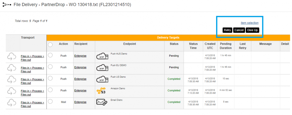 Where endpoints can be selected (using item selection) and the pending status of the delivery can be retried, cancelled or can be given up on.