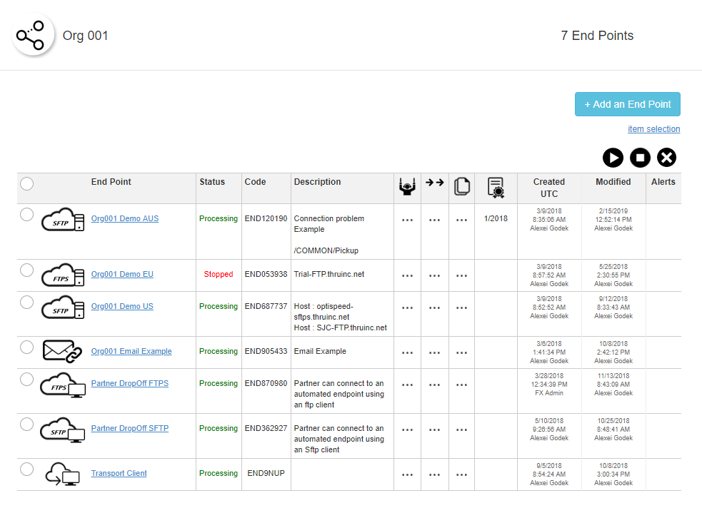 From this view, End Points can be added, managed, started, stopped and deleted.