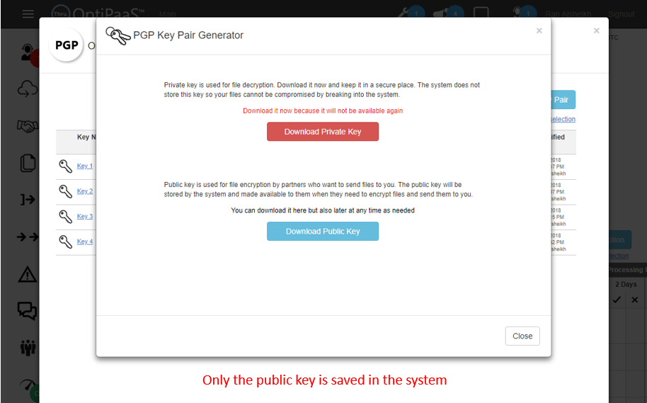 From the PGP Key Pair Generator, you must download the private key since the system does not store it.