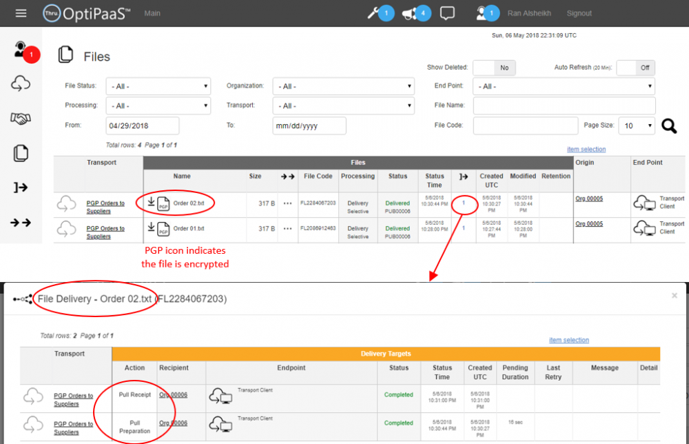 The following screenshot shows an example of PGP encrypted files sent using this transport.