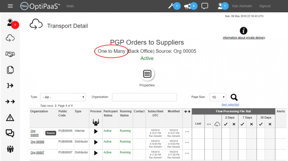 Here is an example of a one-to-many transport with three organizations.