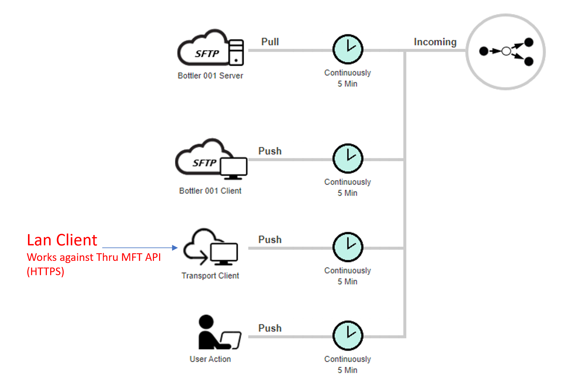 The Thru Transport Client can be used to seamlessly pickup and receive files in shared folders in the absence of FTP.