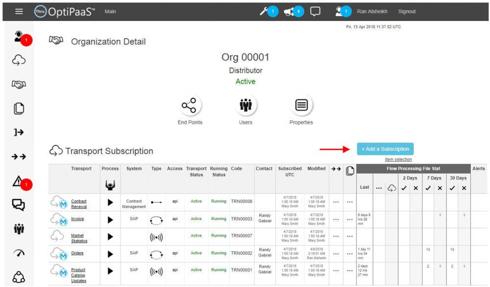 Enterprise users can subscribe organizations to any transport by navigating to the organization detail page and clicking on