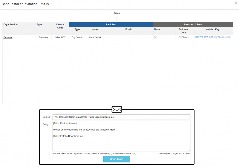 From the Transport Client view, click on the Item selection and select an Organization to send the email invitation.
